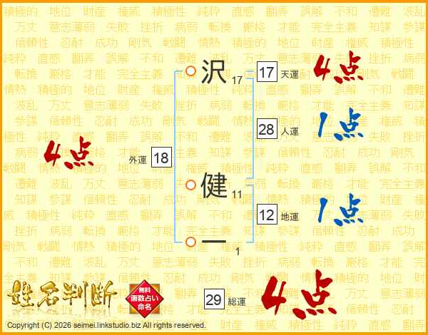 あなたの人生を表す1番重要な運勢です。生涯を通じて影響する総合運となり、主に50歳以降の晩年期に影響を及ぼします。苗字と名前の合計画数。
