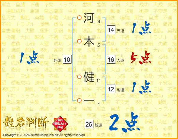 あなたの人生を表す1番重要な運勢です。生涯を通じて影響する総合運となり、主に50歳以降の晩年期に影響を及ぼします。苗字と名前の合計画数。