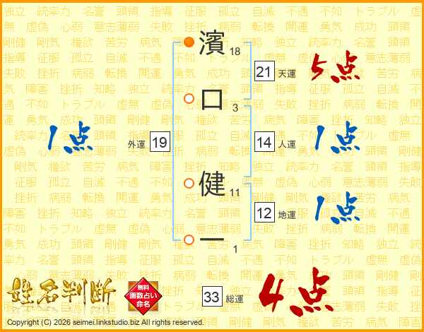 生活面を象徴する運勢です。外部から受ける影響力を表し、結婚運、家庭運や職場、環境への順応性を表します。総運から人運を引いた画数。姓や名が1文字の場合を除く。