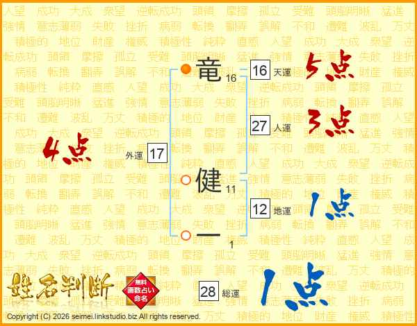 生活面を象徴する運勢です。外部から受ける影響力を表し、結婚運、家庭運や職場、環境への順応性を表します。総運から人運を引いた画数。姓や名が1文字の場合を除く。