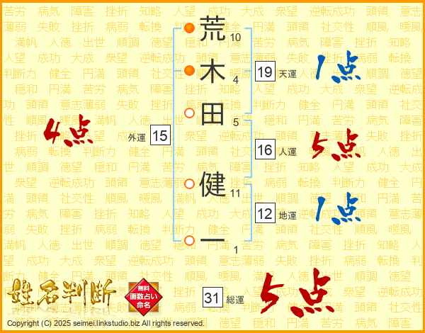 荒(10画)木(4画)田(5画) 健(11画)一(1画)