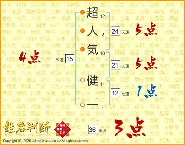 超(12画)人(2画)気(10画) 健(11画)一(1画)