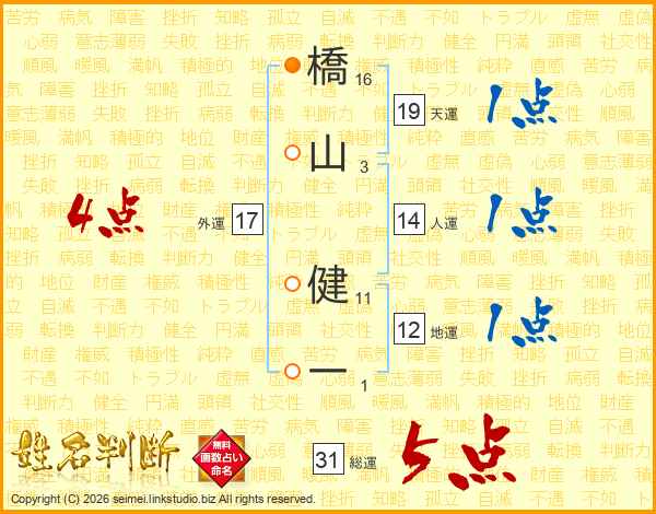 生活面を象徴する運勢です。外部から受ける影響力を表し、結婚運、家庭運や職場、環境への順応性を表します。総運から人運を引いた画数。姓や名が1文字の場合を除く。