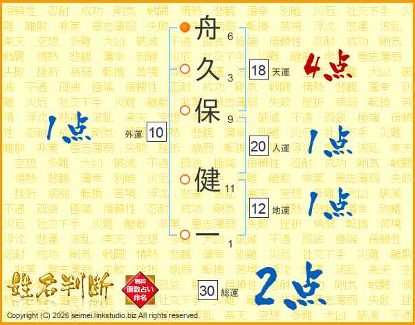 舟(6画)久(3画)保(9画) 健(11画)一(1画)