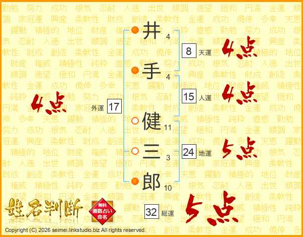 井(4画)手(4画) 健(11画)三(3画)郎(10画)
