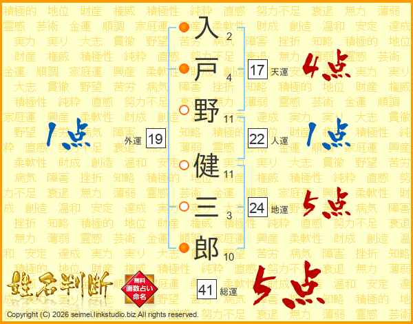 入戸野健三郎さんの総運は41画の5点!