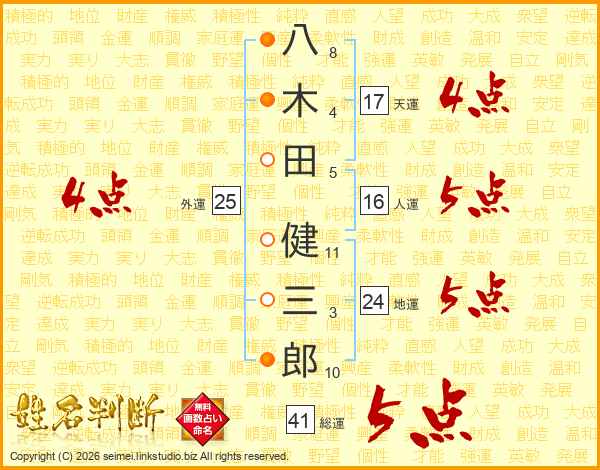 八(8画)木(4画)田(5画) 健(11画)三(3画)郎(10画)