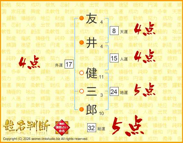 友(4画)井(4画) 健(11画)三(3画)郎(10画)
