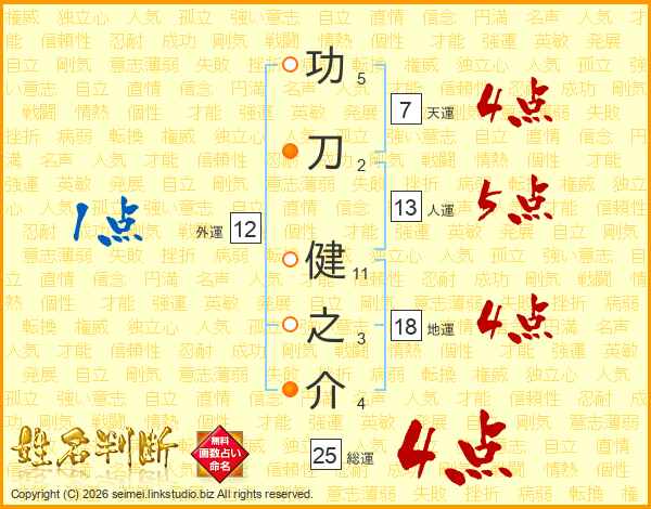 功(5画)刀(2画) 健(11画)之(3画)介(4画)