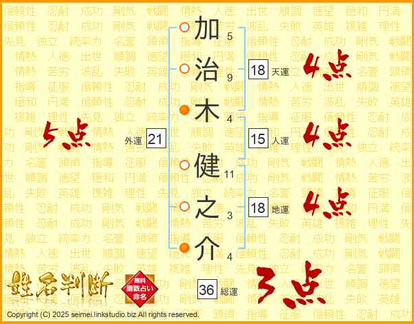 加(5画)治(9画)木(4画) 健(11画)之(3画)介(4画)