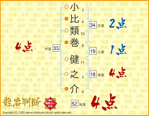 小(3画)比(4画)類(19画)巻(8画) 健(11画)之(3画)介(4画)