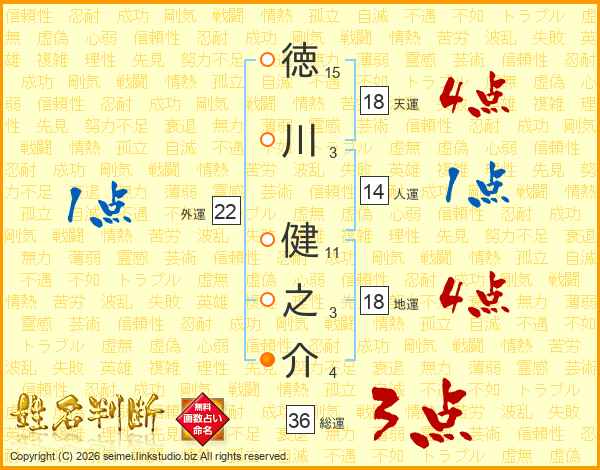 徳(15画)川(3画) 健(11画)之(3画)介(4画)