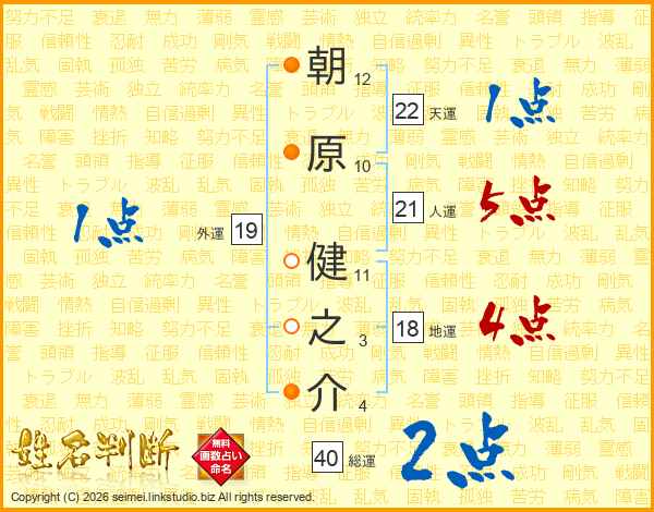 朝(12画)原(10画) 健(11画)之(3画)介(4画)