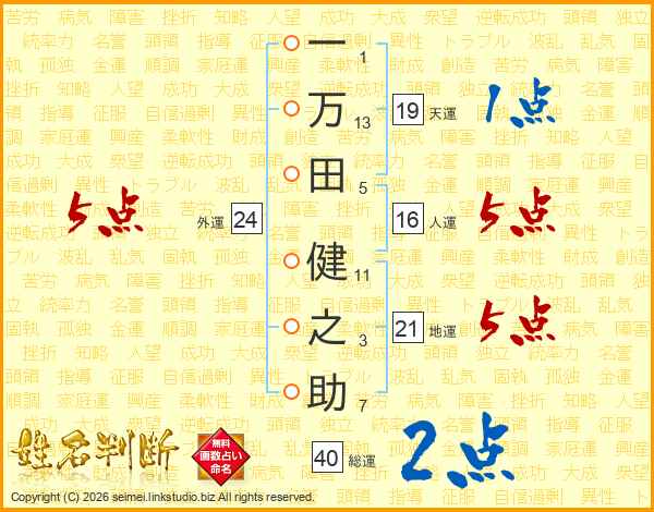一(1画)万(13画)田(5画) 健(11画)之(3画)助(7画)