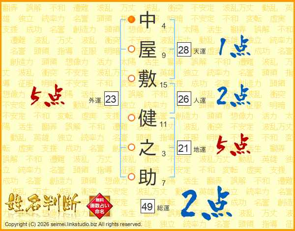 中屋敷健之助さんの総運は49画の2点!