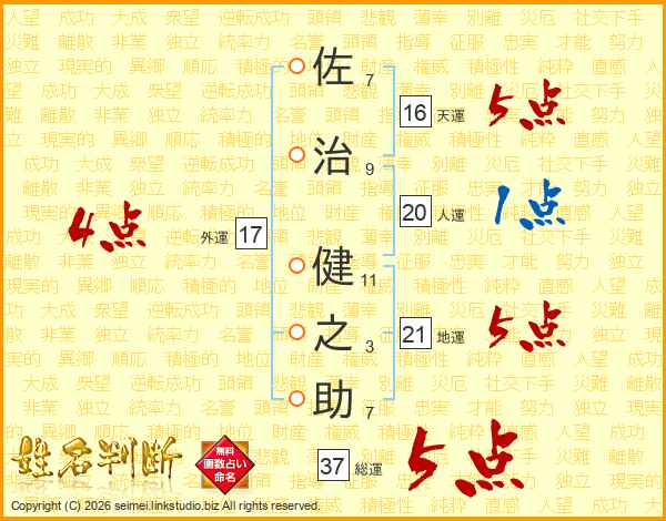 佐(7画)治(9画) 健(11画)之(3画)助(7画)