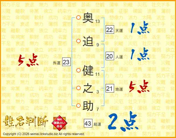 奥迫健之助さんの天運は22画の1点!