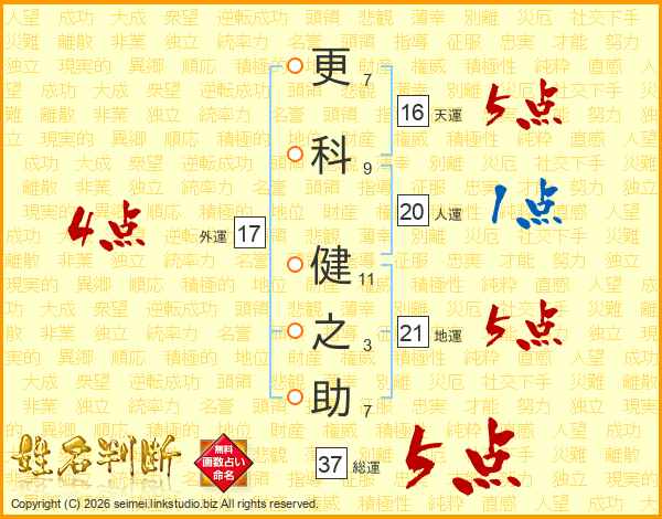 更(7画)科(9画) 健(11画)之(3画)助(7画)