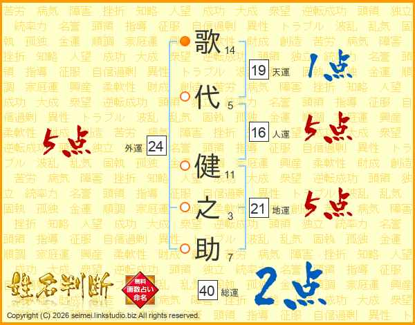 歌(14画)代(5画) 健(11画)之(3画)助(7画)