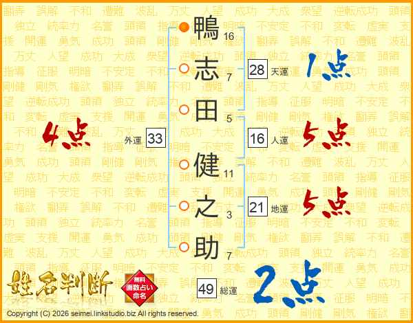 鴨(16画)志(7画)田(5画) 健(11画)之(3画)助(7画)