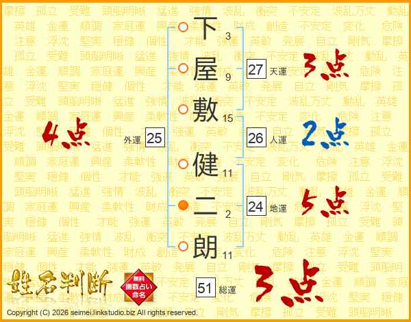 下屋敷健二朗さんの総運は51画の3点!