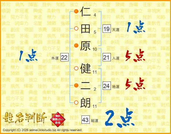 仁(4画)田(5画)原(10画) 健(11画)二(2画)朗(11画)