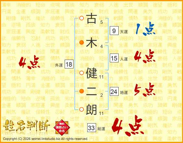 古(5画)木(4画) 健(11画)二(2画)朗(11画)