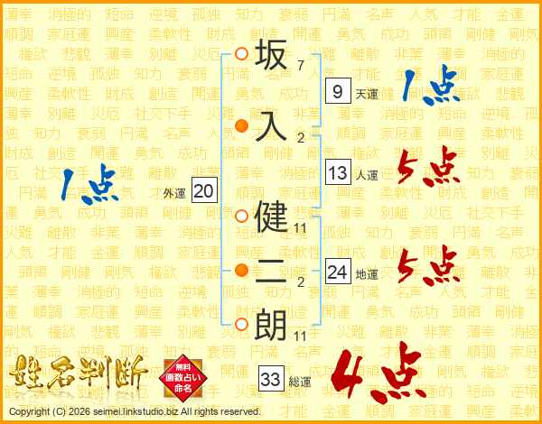坂(7画)入(2画) 健(11画)二(2画)朗(11画)