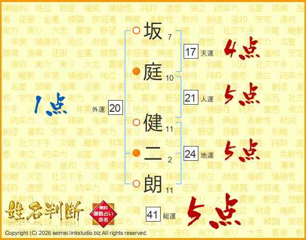 坂(7画)庭(10画) 健(11画)二(2画)朗(11画)