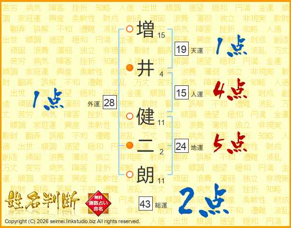 増(15画)井(4画) 健(11画)二(2画)朗(11画)