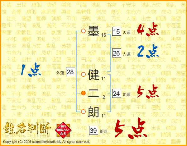 あなたの人生を表す1番重要な運勢です。生涯を通じて影響する総合運となり、主に50歳以降の晩年期に影響を及ぼします。苗字と名前の合計画数。