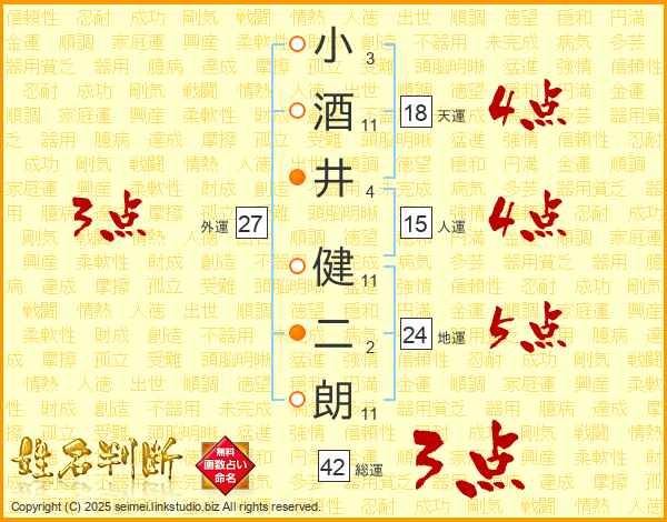小(3画)酒(11画)井(4画) 健(11画)二(2画)朗(11画)