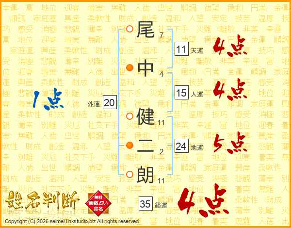 尾中健二朗さんの天運は11画の4点!