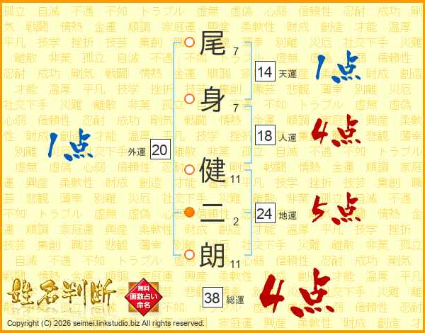 尾(7画)身(7画) 健(11画)二(2画)朗(11画)