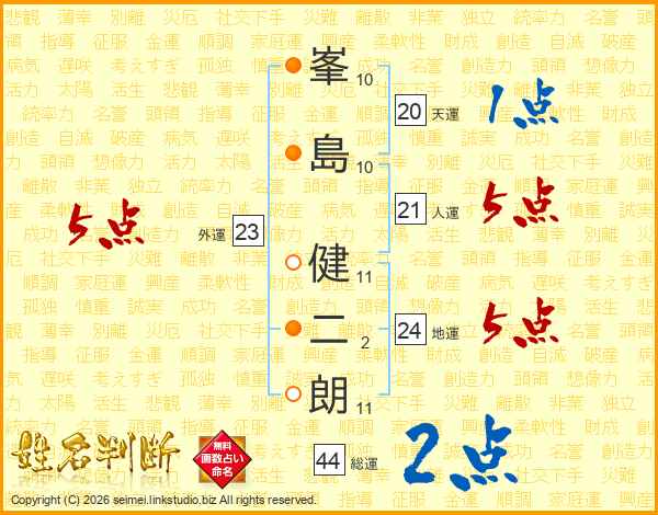 峯(10画)島(10画) 健(11画)二(2画)朗(11画)