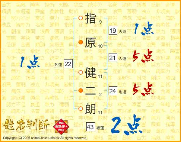 指(9画)原(10画) 健(11画)二(2画)朗(11画)