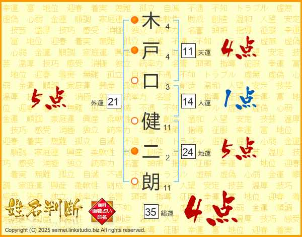 木(4画)戸(4画)口(3画) 健(11画)二(2画)朗(11画)