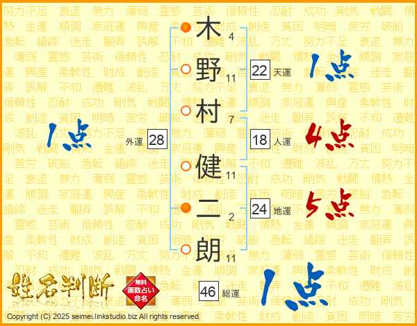 木(4画)野(11画)村(7画) 健(11画)二(2画)朗(11画)