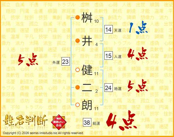 桝(10画)井(4画) 健(11画)二(2画)朗(11画)