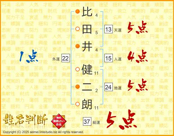 比田井健二朗さんの総運は37画の5点!