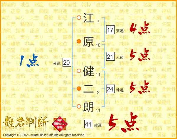 江(7画)原(10画) 健(11画)二(2画)朗(11画)
