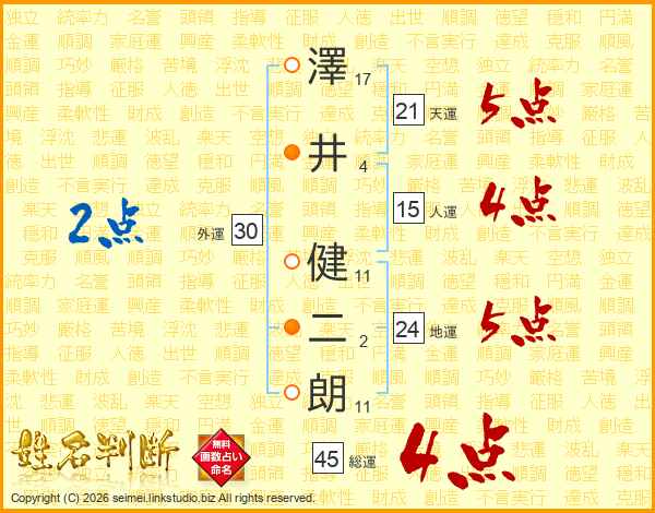 澤(17画)井(4画) 健(11画)二(2画)朗(11画)
