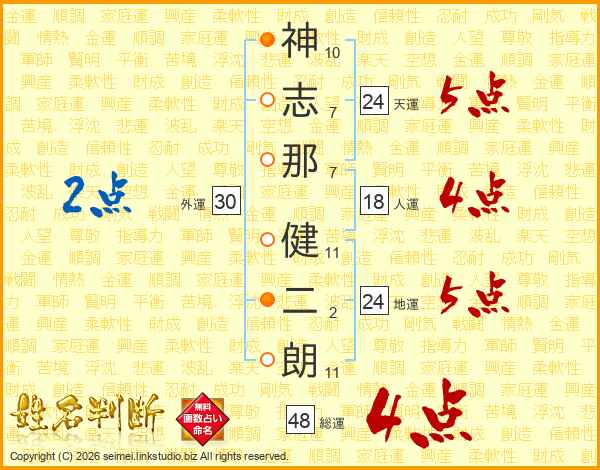 神(10画)志(7画)那(7画) 健(11画)二(2画)朗(11画)