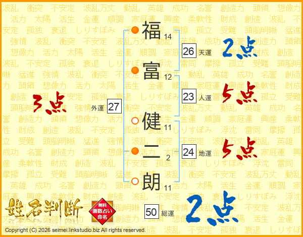 福(14画)富(12画) 健(11画)二(2画)朗(11画)