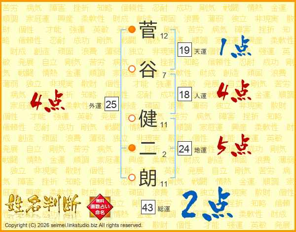 菅(12画)谷(7画) 健(11画)二(2画)朗(11画)