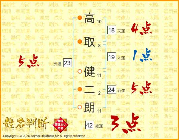高(10画)取(8画) 健(11画)二(2画)朗(11画)