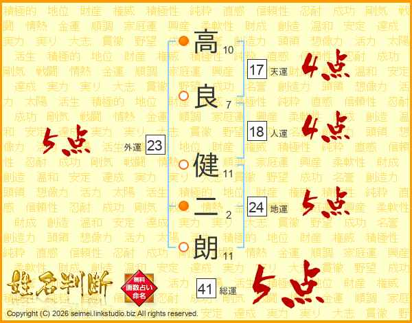 高(10画)良(7画) 健(11画)二(2画)朗(11画)