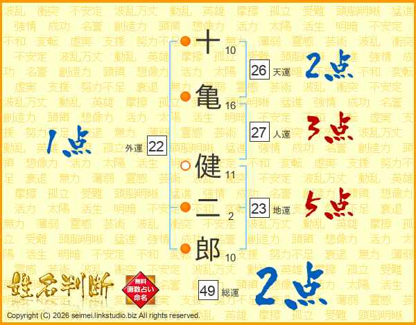 十(10画)亀(16画) 健(11画)二(2画)郎(10画)