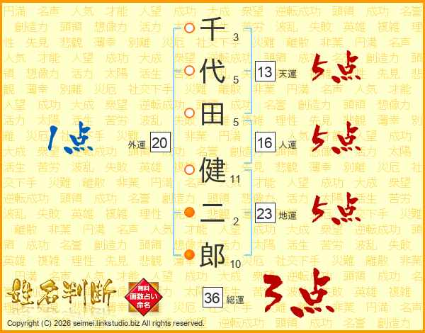 千(3画)代(5画)田(5画) 健(11画)二(2画)郎(10画)