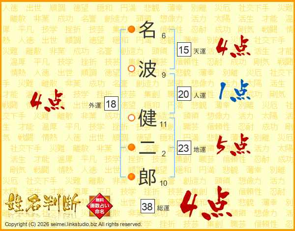 名(6画)波(9画) 健(11画)二(2画)郎(10画)